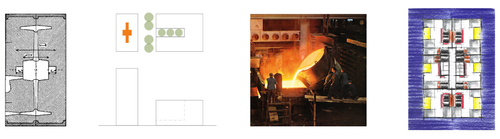 Präzise wie ein Gussstück ist der geplante Tower Komplex am äusseren Ende der Sulzerallee platziert. Die zwei Baukörper erscheinen durch gemeinsame Fluchten als Ensemble und spannen einen begrünten Zwischenraum auf. Die Idee des «Gussstück» prägt das innen räumliche Konzept des Erschliessungssystems im Hochhaus, durch «Gusskammern» werden attraktive Zonen mit Mehrfachnutzungen geschaffen.