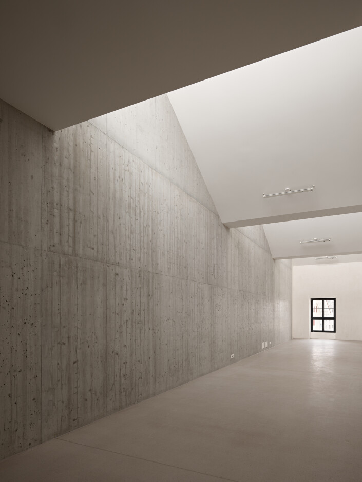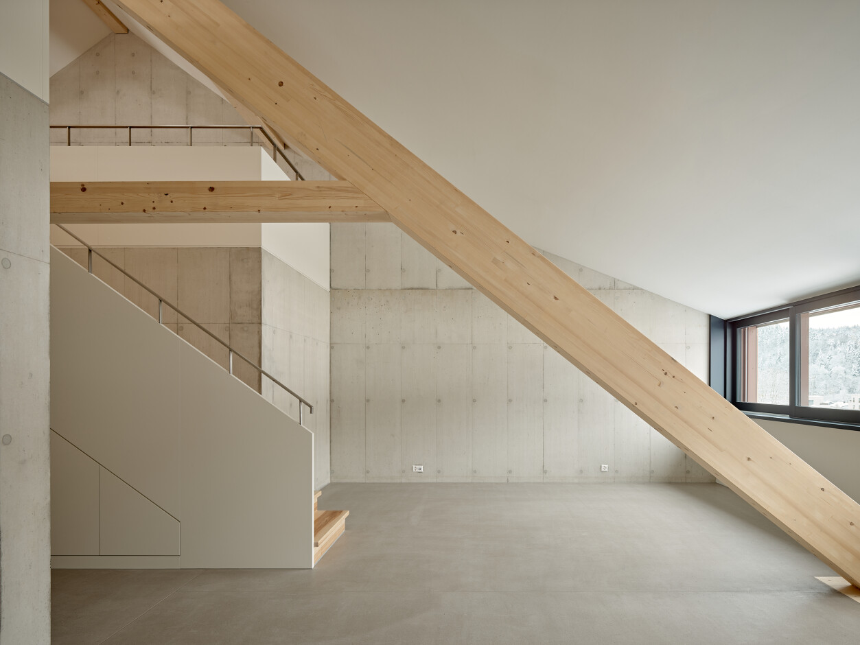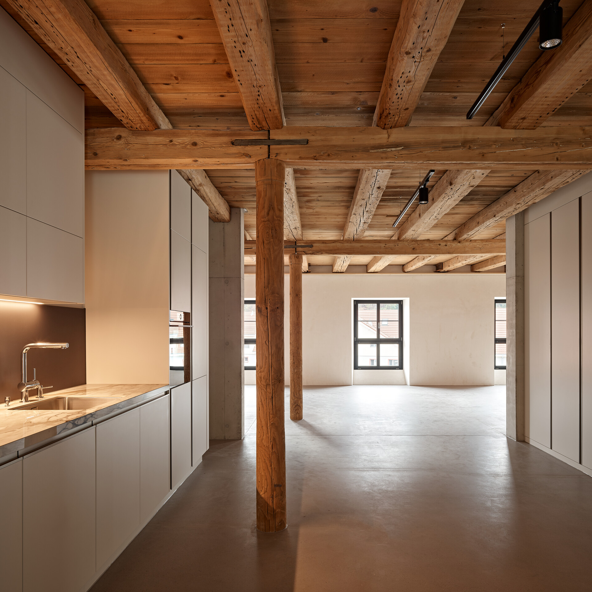Prozessauszug: Dem Erscheinungsbild der alten Spinnerei von aussen und der Hallenkonstruktion von innen galt es den Vortritt zu geben und die Entwurfsarbeit hatte sich dieser Prämisse unterzuordnen. Die eine langgezogene Lukarne konnte mit der Denkmalpflege mehreren kleineren vorgezogen werden, um ein ruhiges Dachbild selbstverständlich zu vermitteln und erst auf den zweiten Blick die neue Gestaltung erkennbar machen. Im Inneren sind Grundrisstypologien massgeschneidert umgesetzt, welche die Statik (Decke und Stützen) mit ihrem Raster in Szene setzen.