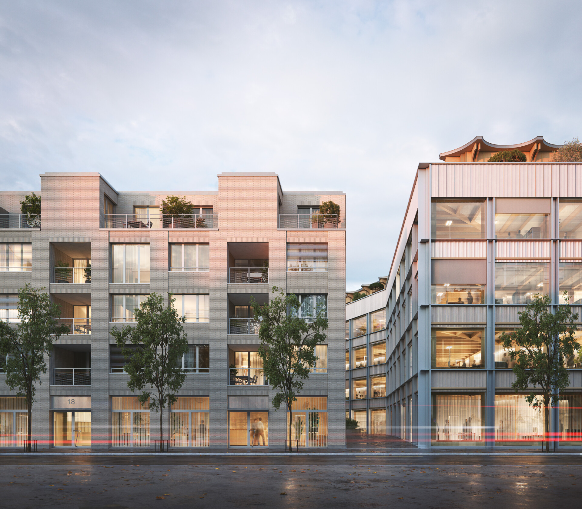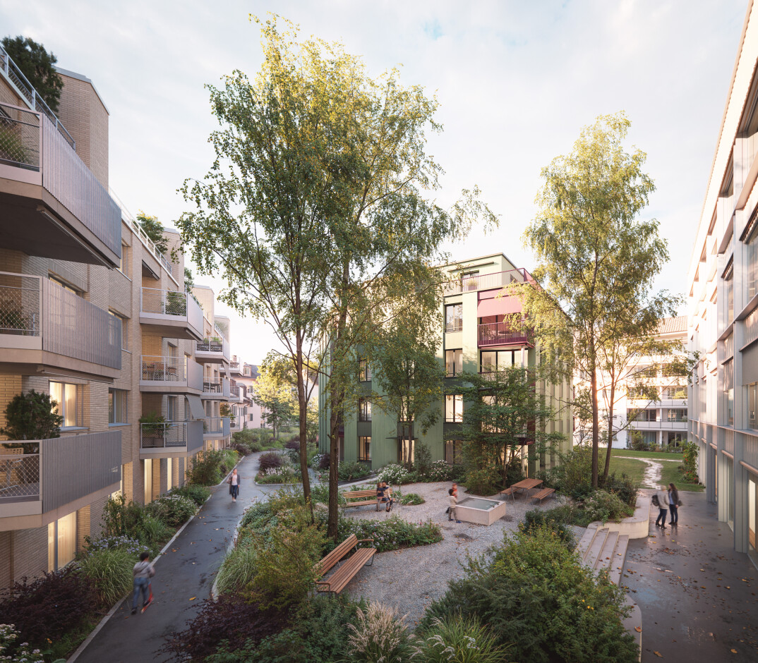 Prozessauszug: Nachhaltiges Bauen mit Integration von Anteilen des Bestandes (zwei Geschosse Tiefgarage) ist eine wichtige Thematik im Bauvorhaben. Die flexible Holzbaukonstruktion des neuen Regionen-Hauptsitzes der Stadt stärkt diese verantwortungsbewusste Haltung. Die ergänzenden zwei Wohnbauten unterstützen dies mit innovativen Wohngrundrissen auf kleinem Fussabdruck, was ein Beitrag zum Wohnungsmangel in Winterthur auf sozialer Ebene mit einem bunten Wohnungsgrössen-Mix sein soll.