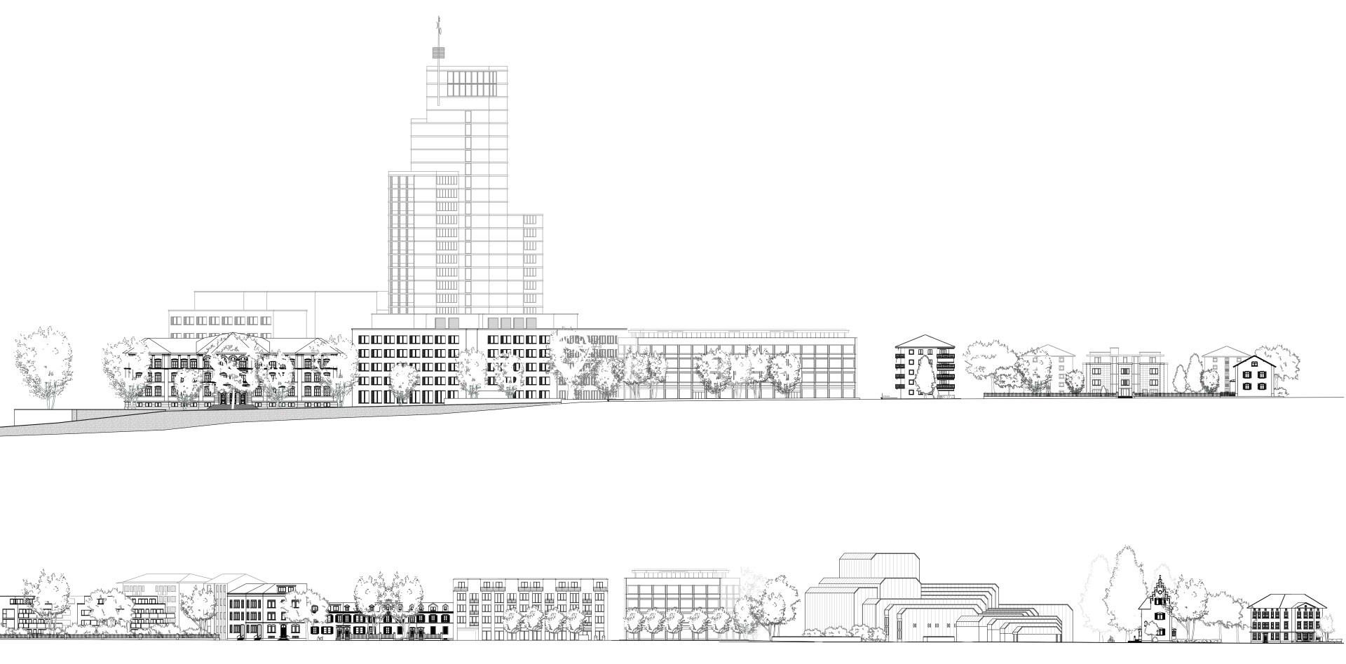 Ein Ort im Zentrum der Stadt entsteht, welcher die Thematik Stadt-Land verkörpert. Städtebaulich werden die Strassenfluchten entlang der St.-Georgen-Strasse und der Theaterstrasse mit neuen Volumen gestärkt. Im Hof wird ein neuer Punktbau maximal «locker» in die Nachbarschaft und zur denkmalgeschützten Siedlung eingepasst um sensibel mit nicht ausgereizten gesetzlichen Abständen zu reagieren.