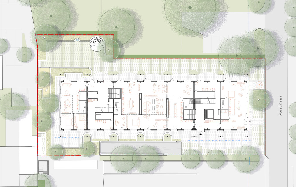 Die Sanierung und Umnutzung des Bürogebäudes an der Konradstrasse 15 soll eine nachhaltige, mustergültige Transformation in einen Mietwohnbau sein, bei dem die Entscheide «wo sinnvoll» konsequent auf die Nachhaltigkeit ausgelegt wird. Die städtebauliche Präsenz zur Konradstrasse ist mit einer Volumenerhöhung forciert (Ausnutzung) und im Erdgeschoss stützt diese Haltung das Angebot von Gewerbeflächen. Die Wohnungen erhalten projektprägend übergrosse Aussenräume, welche den Ausdruck der Architektur zeichnen.