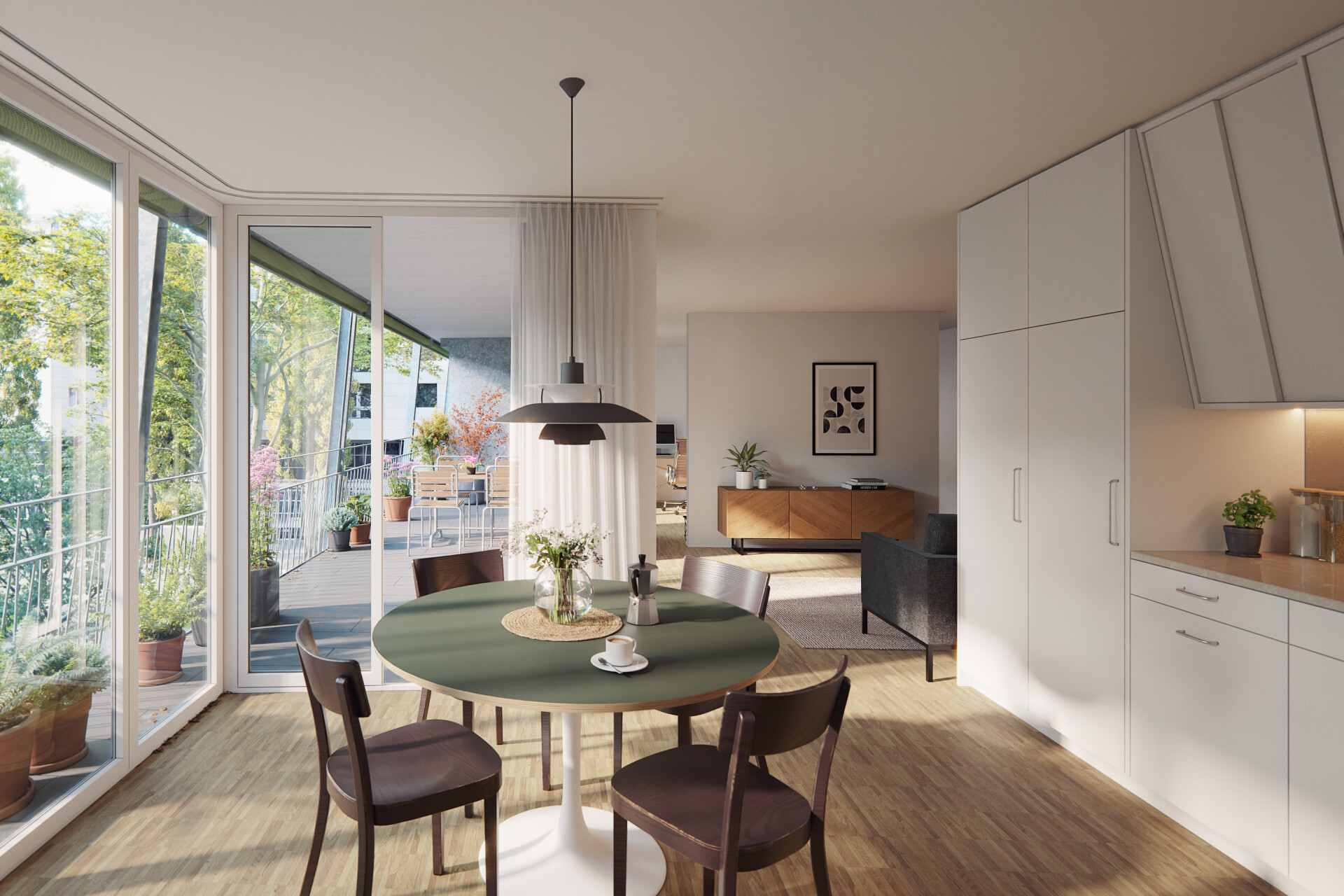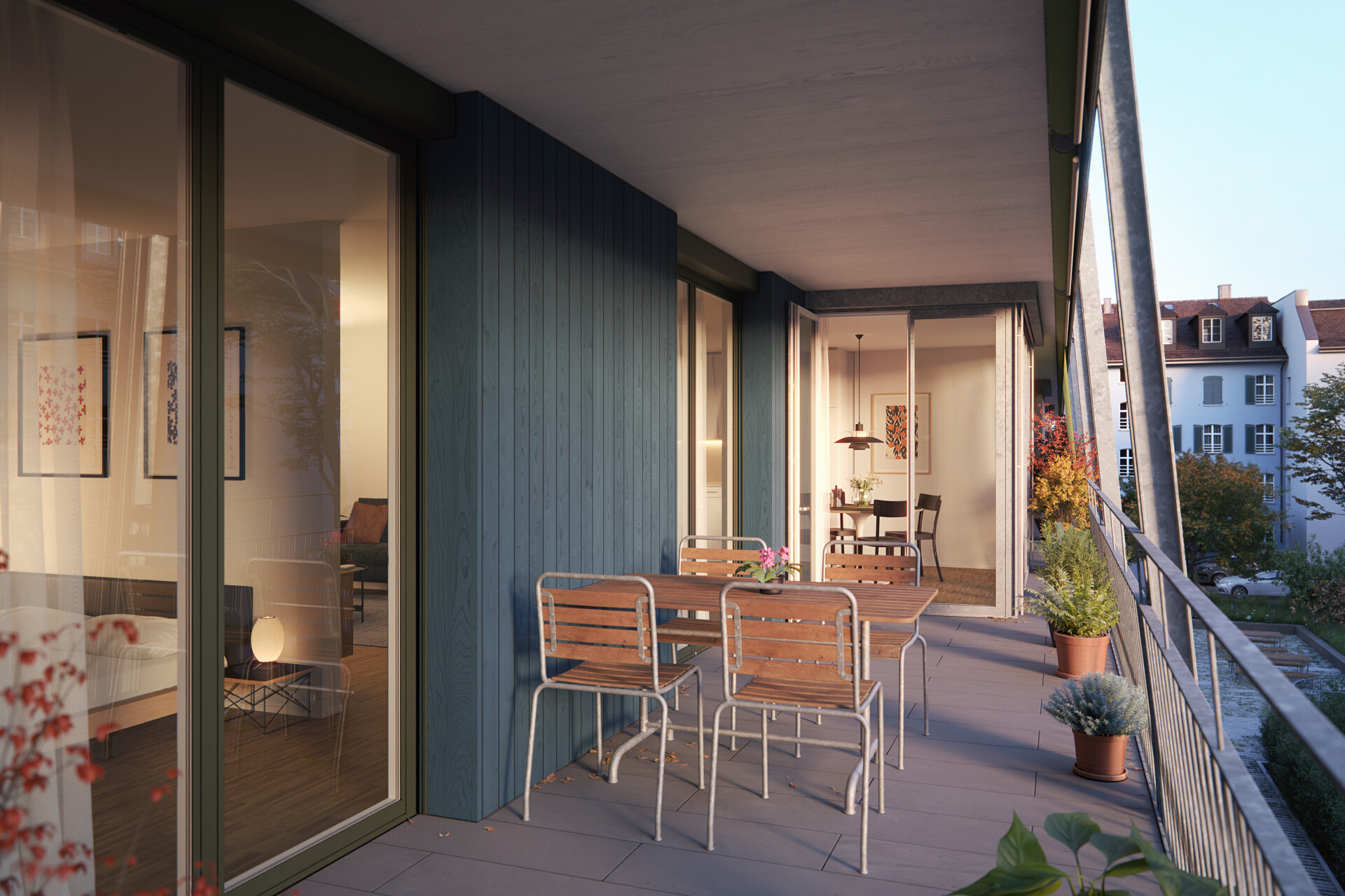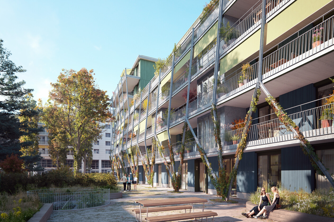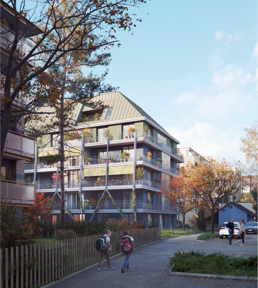 Prozessauszug: Das bestehende Gebäude an der Konradstrasse 15 weist ideale Merkmale für die Umsetzung eines hohen Nachhaltigkeitsstandards auf. Das bestehende Tragwerk (Rohbaustruktur) ist vollständig wieder verwendbar, was den CO2 verbrauch massiv senkt. Die Materialwahl bei der Aufstockung, der Balkonerweiterung und im Innern ist geprägt von nachhaltigen Produkten wie z.B. Holz und Recyclingmaterialien. Die Photovoltaik auf dem Dach und in dem Dach sorgt für Energiegewinn und Fassadenbegrünungen und Entsiegelungen im Belag forcieren die Biodiversität in der Stadt.
