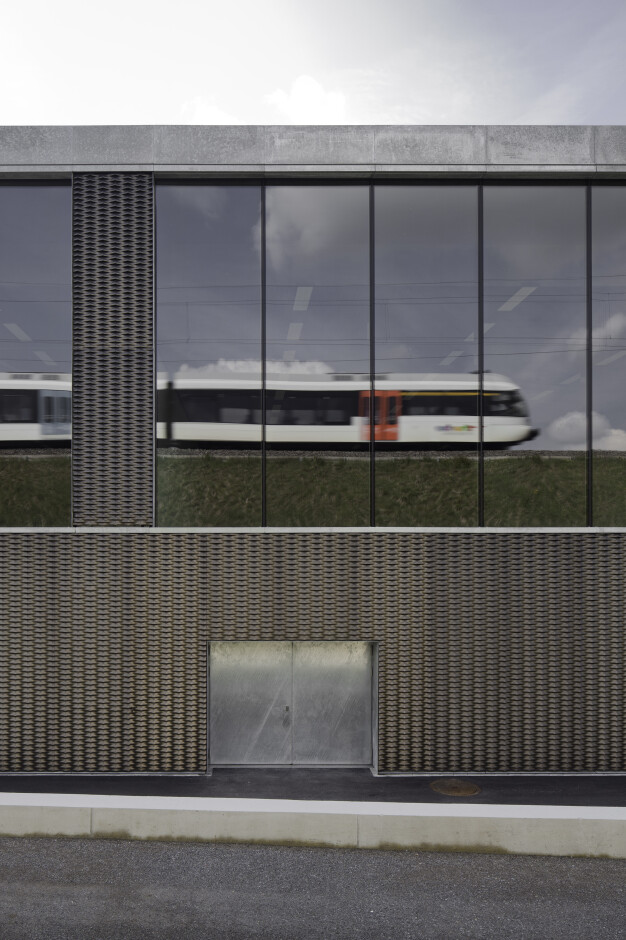 Das Gebäude ordnet sich ein in eine Zeile von grösseren Bauten, die neben dem Bahndamm verläuft. Es ist ebenerdig organisiert, damit eine optimale Mehrzwecknutzung mit Anlieferung möglich ist. Die Schnittstelle Office kann multiflexibel Foyer, Sporthalle, Mehrzwecksportraum sowie den Aussenraum bedienen.