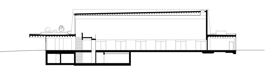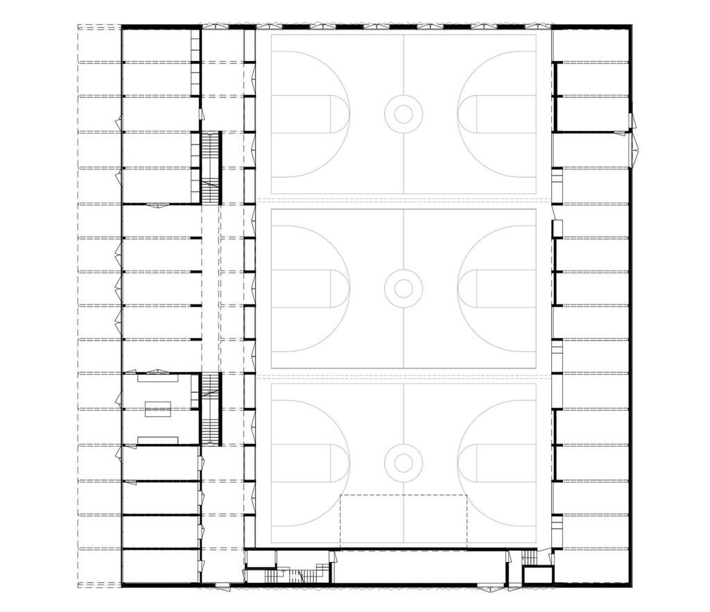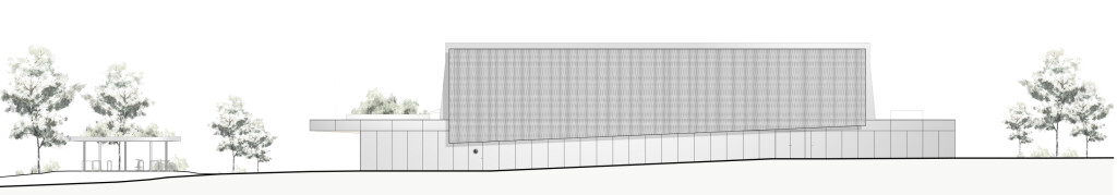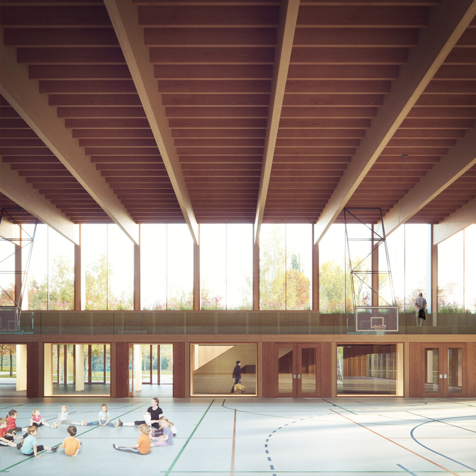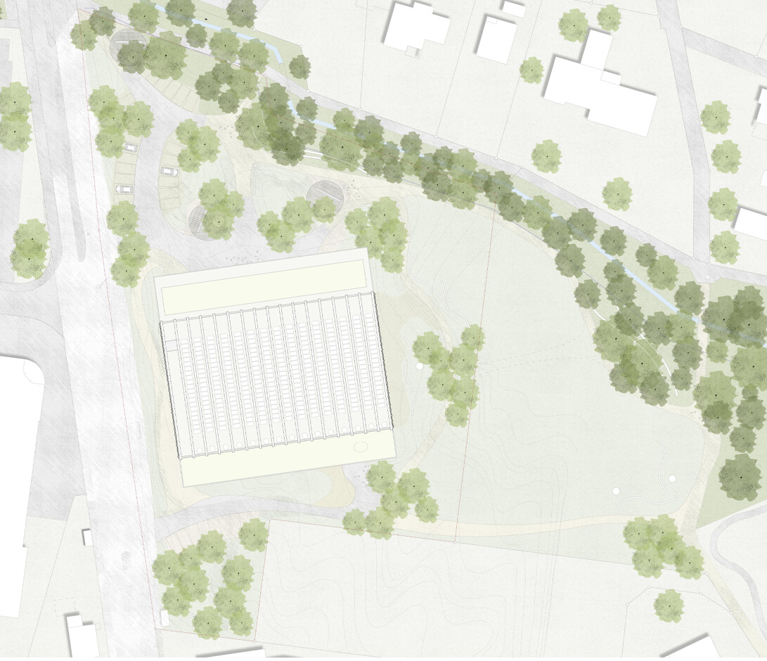 Die Dreifachhalle definiert mit Präsenz und Eleganz einen öffentlichen Raum entlang der Kreuzlingerstrasse, deren ebenerdigen Zugang über den Vorplatz zugleich den Eintritt in den Park entlang des Bachs markiert. Das architektonische Konzept mit der grossflächig verglasten Nordseite schafft optimale Lichtverhältnisse und eine spannende Aussen-/Innenbeziehung. Die festliche Galerie, zugänglich über zwei Treppen vom Foyer, eröffnet sich ein reizvoller Blick auf den Park über das Vordach "infinity green", welches nicht nur die Biodiversität fördert, sondern in Kombination mit der Holzbauweise die ökologische Nachhaltigkeit stärkt.