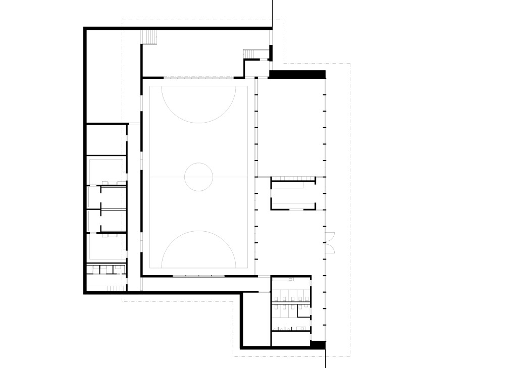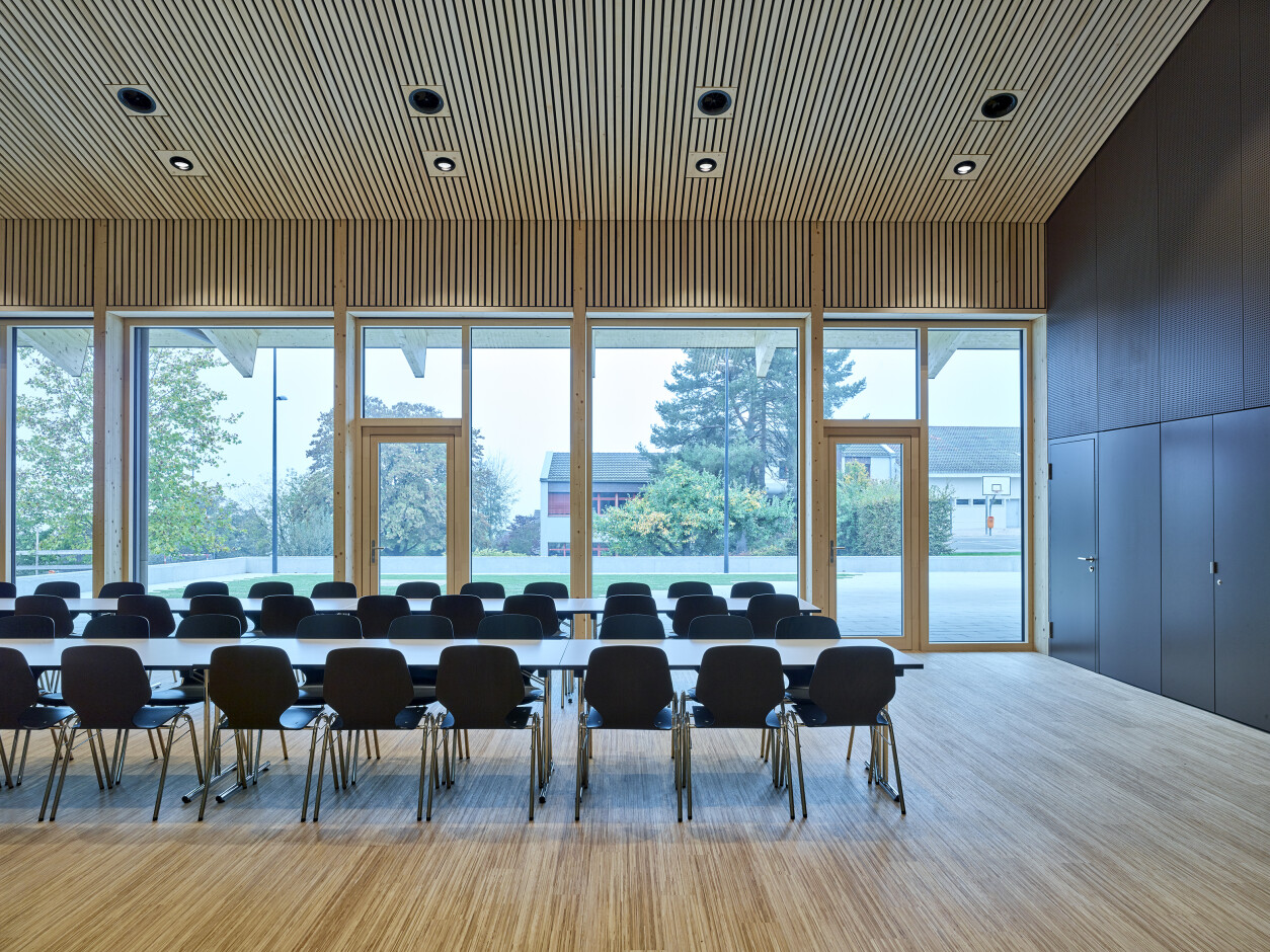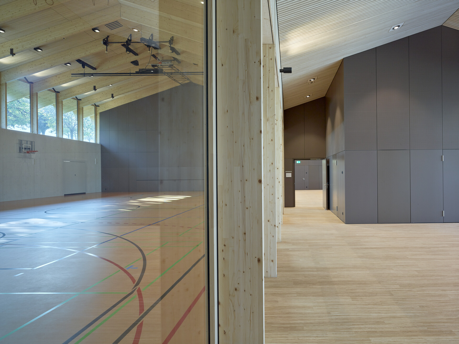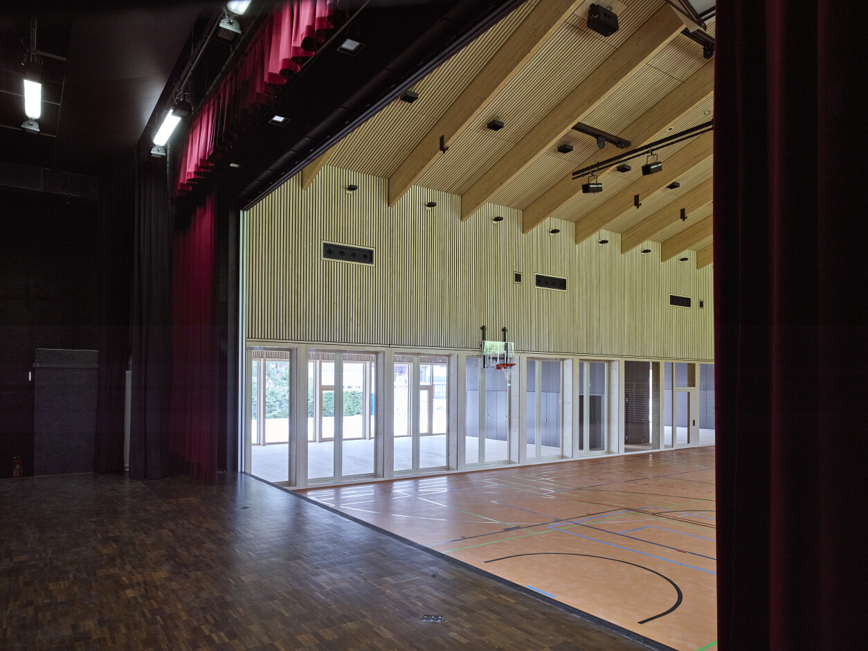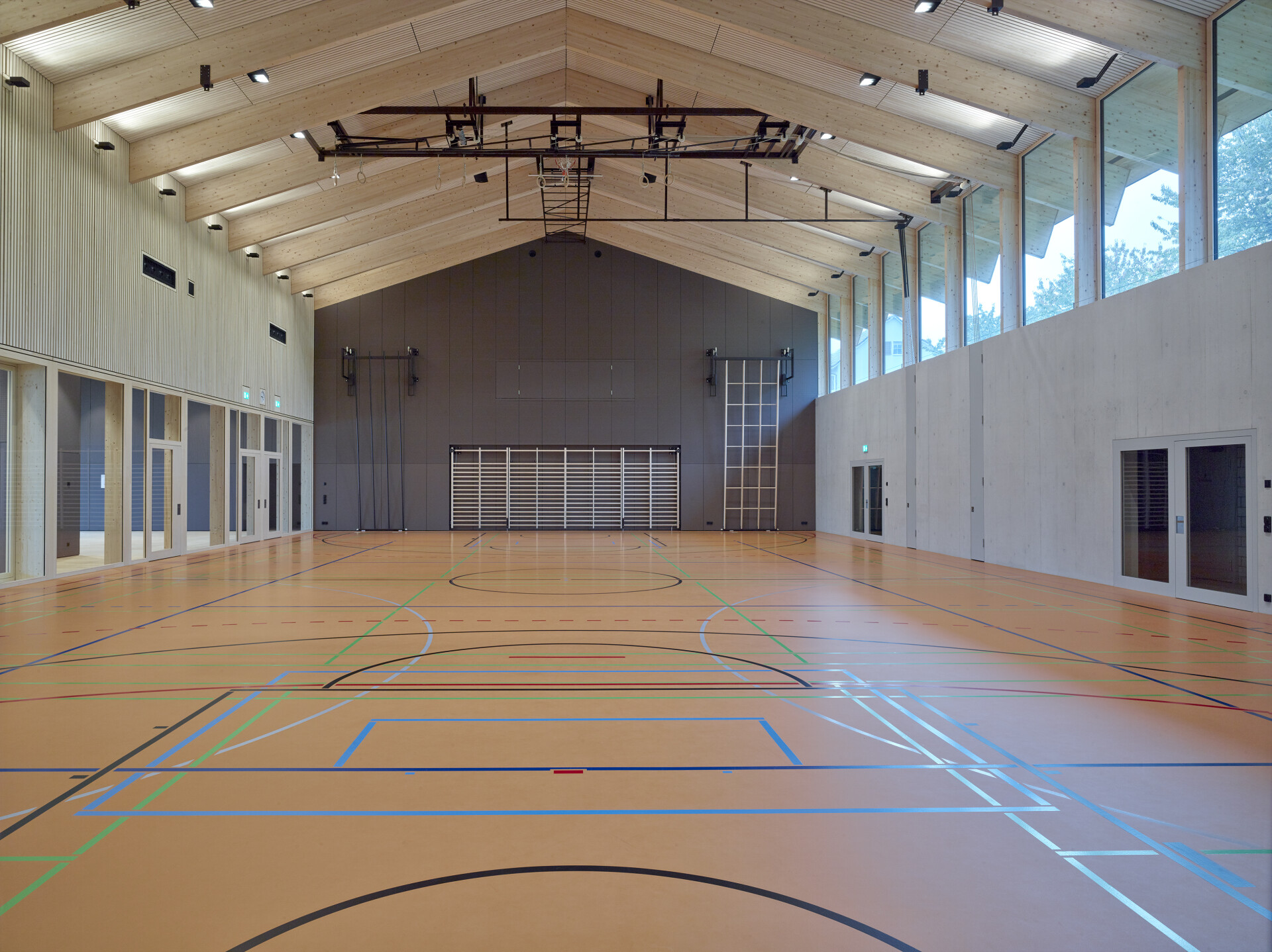 Die Sport- und Mehrzweckhalle mit Gemeindesaal ist konsequent auf einem Geschoss organisiert. Gezielt gesteuerte Abläufe für eine optimale Veranstaltungsnutzung mit Bühne, Saal und Sportraum konnten vertieft strukturell entwickelt werden. Das Office als Schaltstelle bedient den Gemeindesaal, das Eingangsfoyer für Apéro und Ausgabe sowie den Sport- und Mehrzweckraum, die Anlieferung ist direkt über den Vorplatz organisiert.
