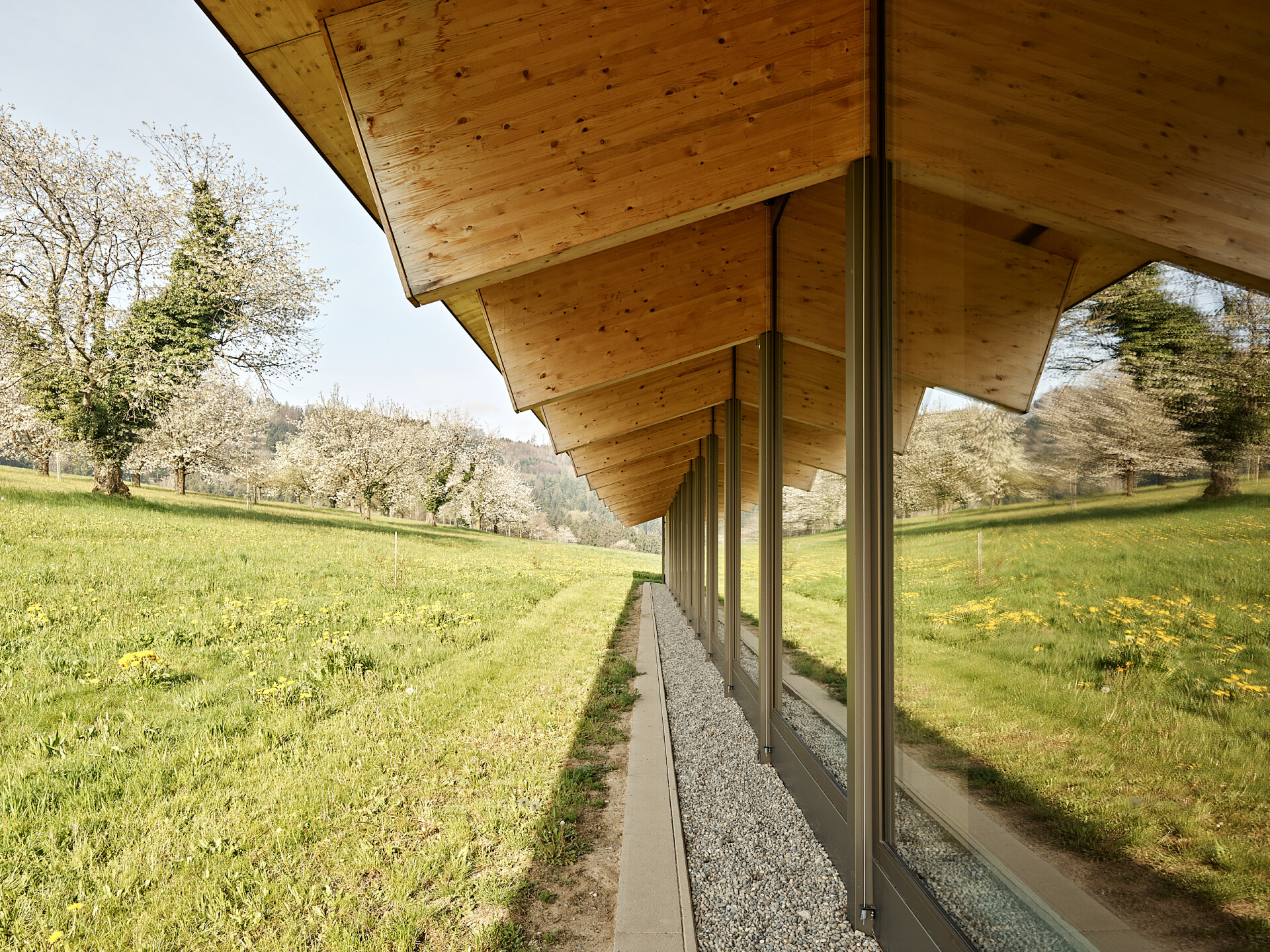 Prozessauszug: Ein reiner Holzbau wird auf eine betonierte Bodenplatte mit massivem Abschluss in den Hang gestellt. Ein markantes Dach überspannt die Grossräume und schützt das Holz mit auskragenden, ästhetischen Vordächern, die auch Schutz für die Besucher sowie die Fassaden bieten. Die attraktiven Innenräume sind durch Verglasungen hell und lichtdurchflutet und bieten zum Hang den Blick zu wunderbaren Obstbäumen und ins Tal eine spektakuläre Fernsicht.