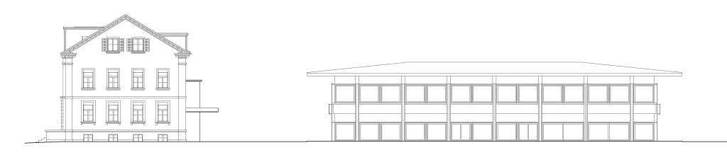 Anstelle der alten Turnhalle wurde ein neues Schulhaus städtebaulich so platziert, dass der Dialog mit dem altehrwürdigen Schulhaus Dorf I bestehen bleibt. Die Struktur des Schulhauses ist auf allen Geschossen flexibel, um zukünftige Änderungen der Schulräume baulich zu ermöglichen. Ein markantes Dach schützt die Fassade, schafft natürlichen Schatten und bietet gleichzeitig eine gedeckte Pausenzone für die Schüler.