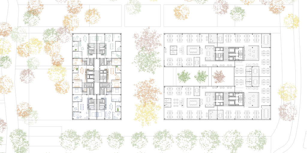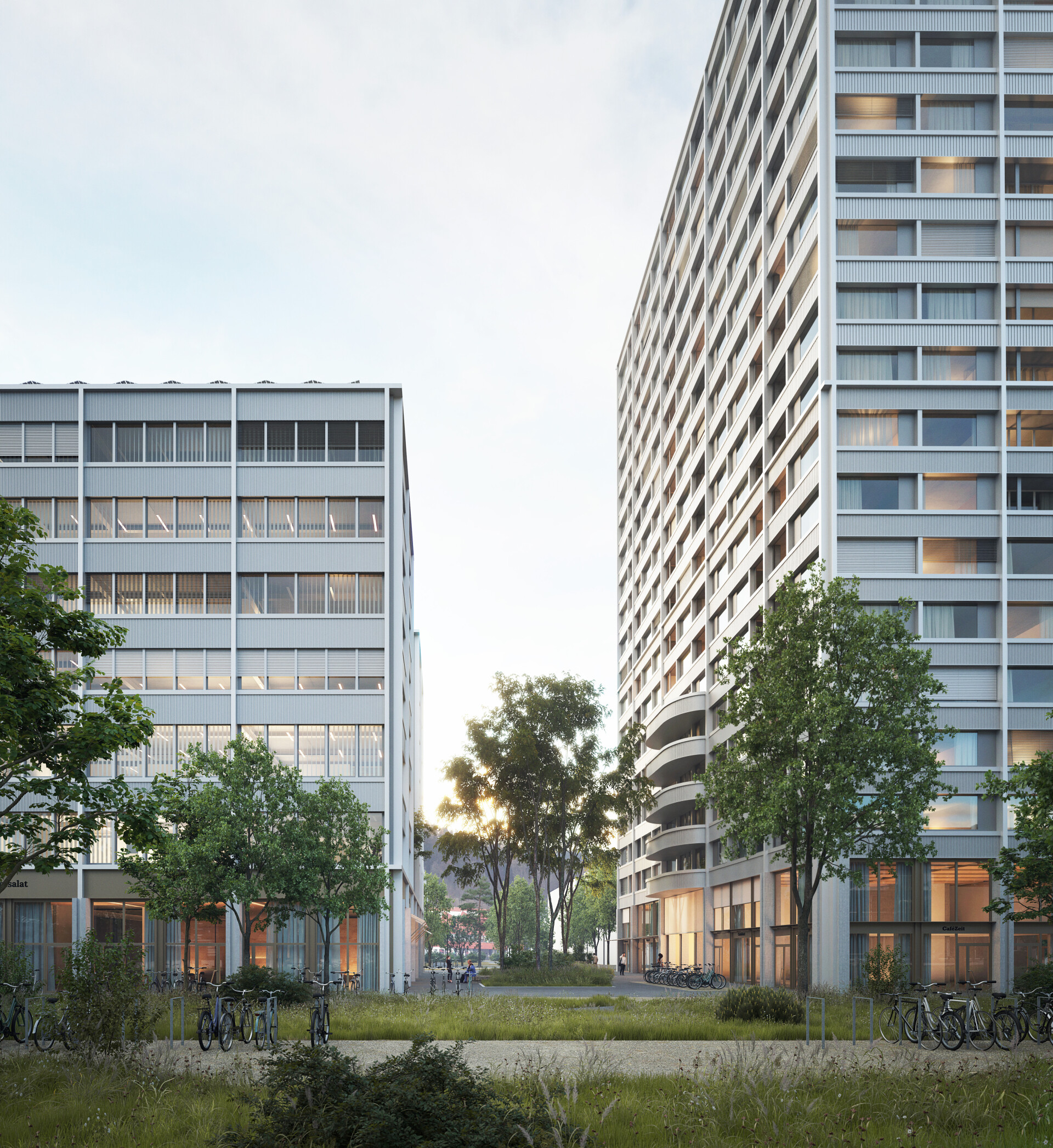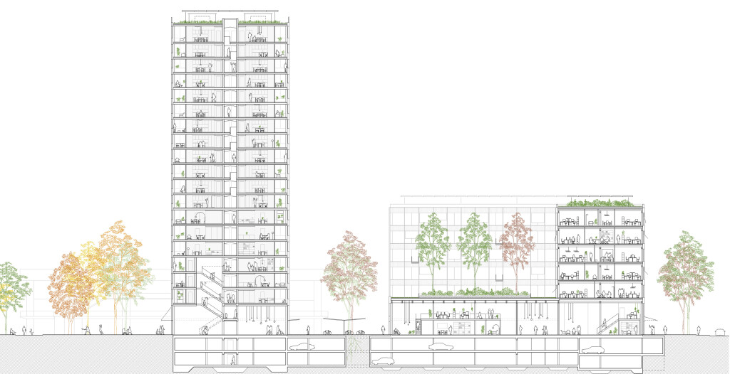 Prozessauszug: Wohnen im Hochhaus mit Qualität bieten die Grundrisse mit drei verschiedenen Geschosstypologien, wozu Loggias (windgeschützt), schöne Wohnräume übers Eck und Diversität im Wohnungsmix gehören. Workingspace Zonen, Gemeinschaftsräume für’s Wohnen und Gewerbe im Erdgeschoss zur Belebung des Quartiers gehören ebenfalls zu dieser Qualität. Als extra gilt ein Pavillon an der Strassenkreuzung, welcher durch das Quartier „eingenommen“ werden kann für Glühweinverkauf im Winter, Bistro mit Aussenbestuhlung im Sommer zur neuen Baumallee oder „einfach“ für eine Idee aus dem Quartier.