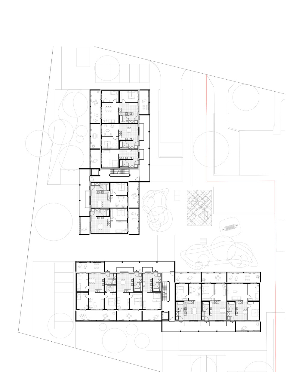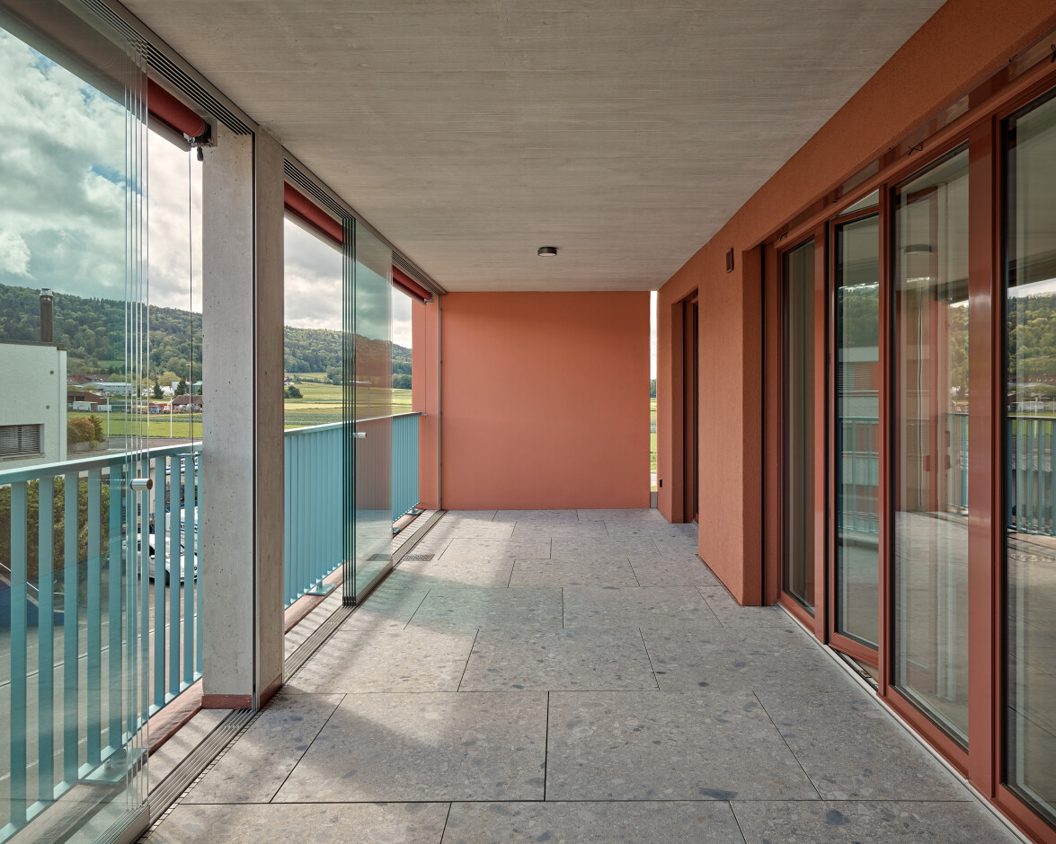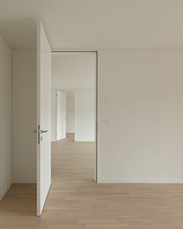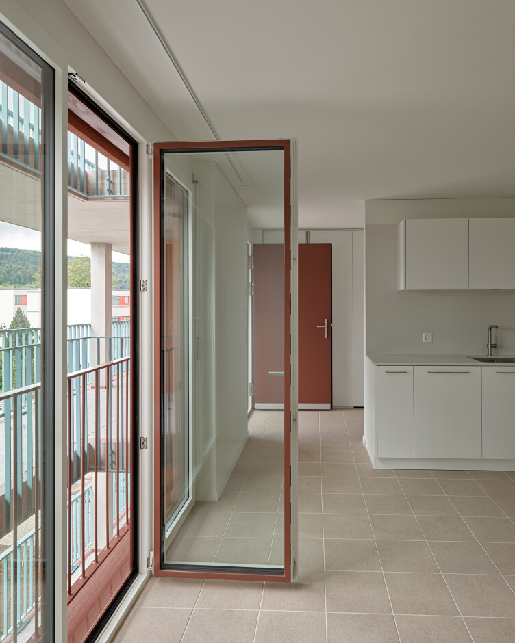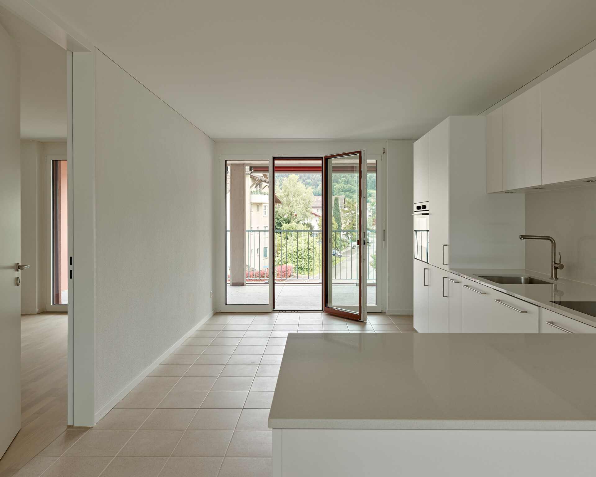 Eine einfache, direkte Wohnungstypologie prägt die Überbauung. Ohne Erschliessungs-/Korridorflächen bieten die Wohnungen kompakte, gutproportionierte Zimmer an mit dem Herzstück, einer hellen, geräumigen und häuslichen Küche mit ausreichendem Platz für einen grossen Tisch (je nach Wohnungsgrösse). Ausnutzungsbevorzugt wurden in Zusammenarbeit mit der Bauherrschaft sehr grosse, unbeheizte Jahreszeitenzimmer entwickelt, die vollständig geöffnet werden können.